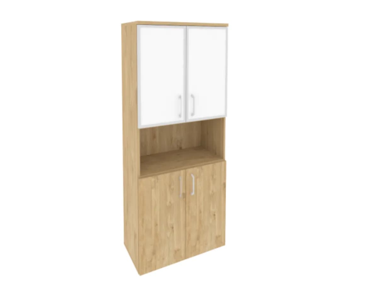 Шкаф высокий широкий (2 низких фасада ЛДСП + 2 низких фасада стекло лакобель в раме) тиквуд светлый