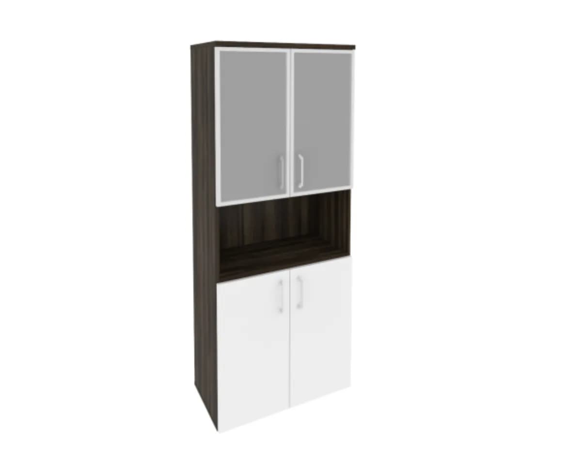 Шкаф высокий широкий (2 низких фасада ЛДСП + 2 низких фасада стекло в раме) фасад белый бриллиант дуб мали