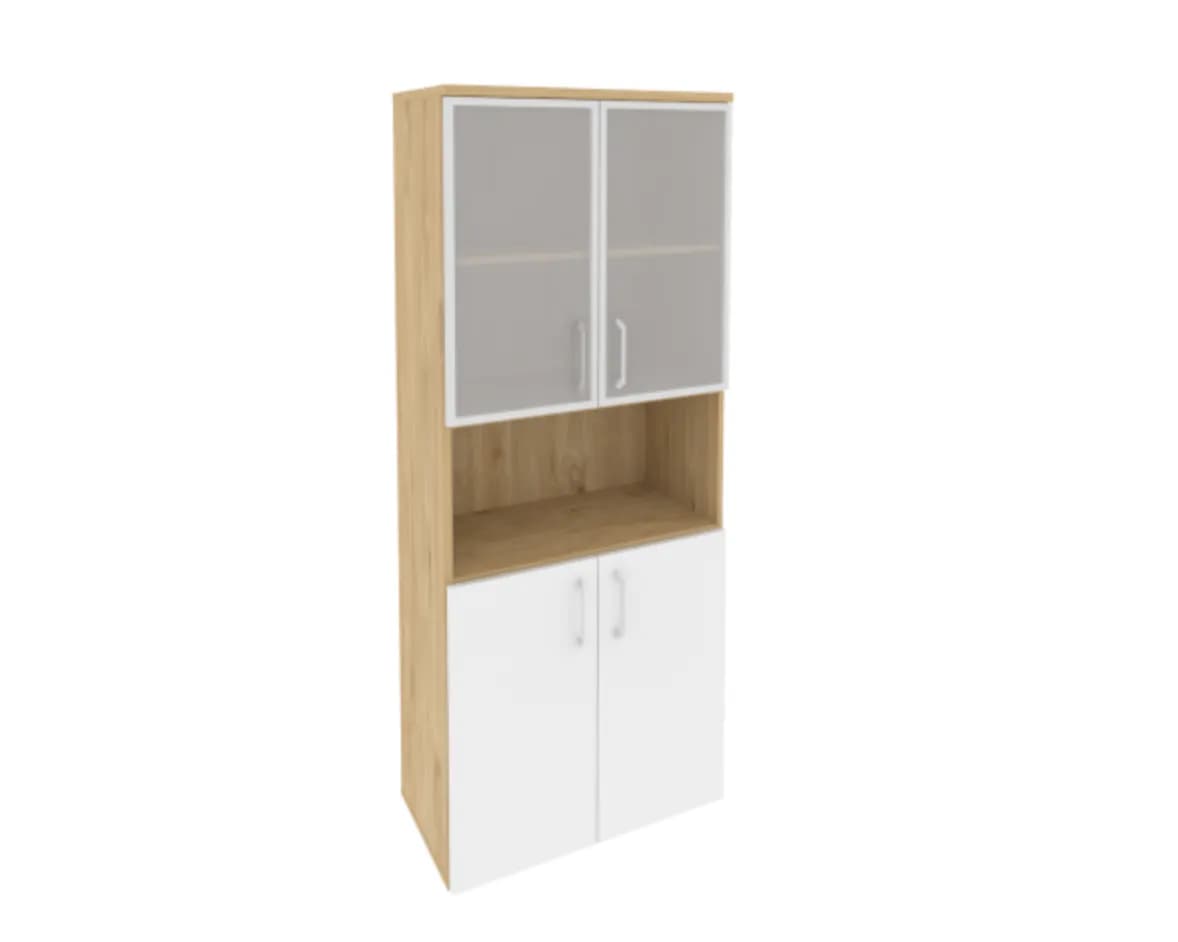 Шкаф высокий широкий (2 низких фасада ЛДСП + 2 низких фасада стекло в раме) фасад белый бриллиант тиквуд светлый
