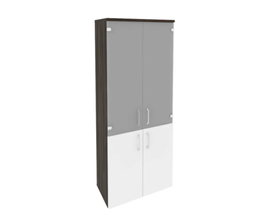Шкаф высокий широкий (2 низких фасада ЛДСП + 2 средних фасада стекло) фасад белый бриллиант дуб мали