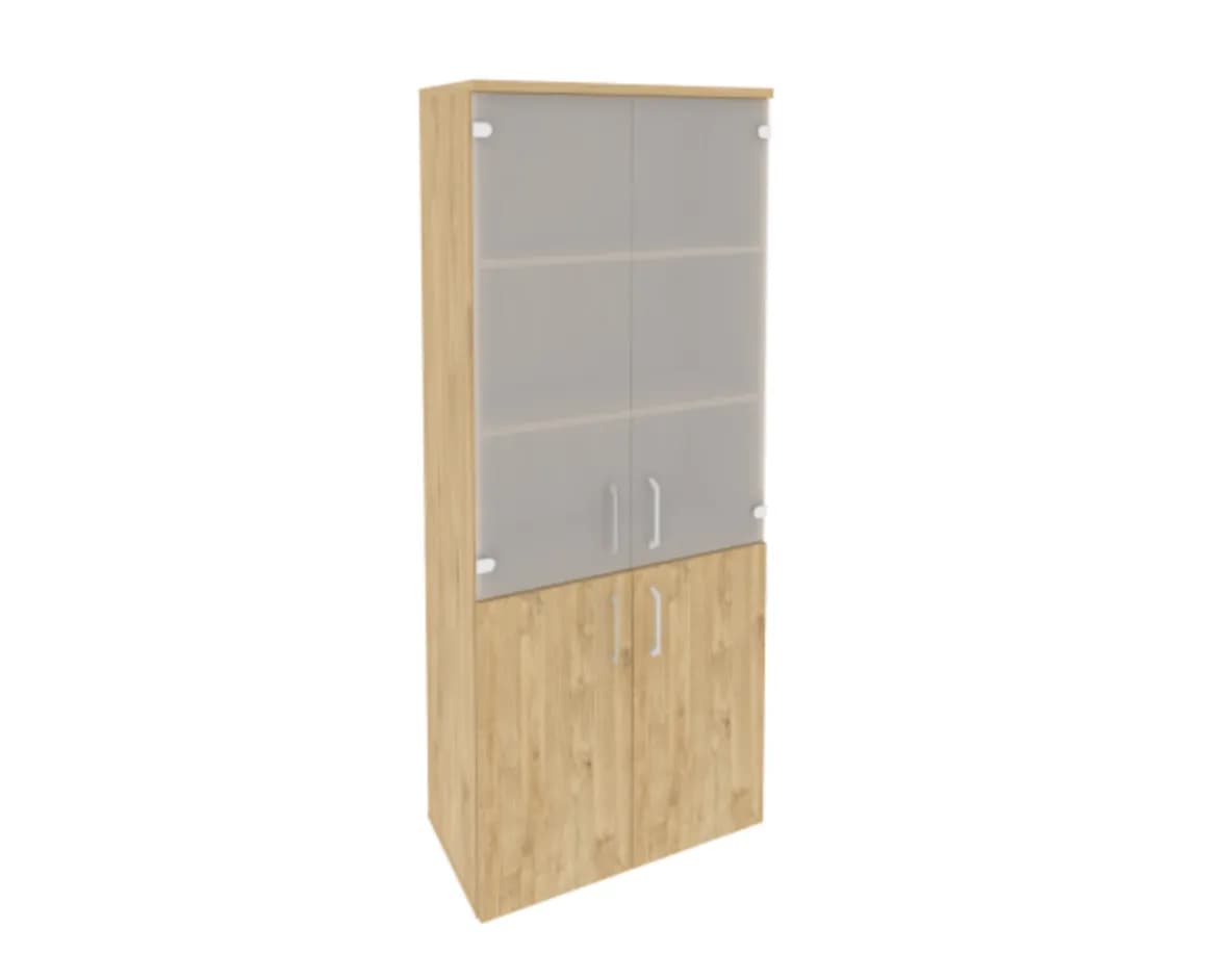 Шкаф высокий широкий (2 низких фасада ЛДСП + 2 средних фасада стекло) тиквуд светлый