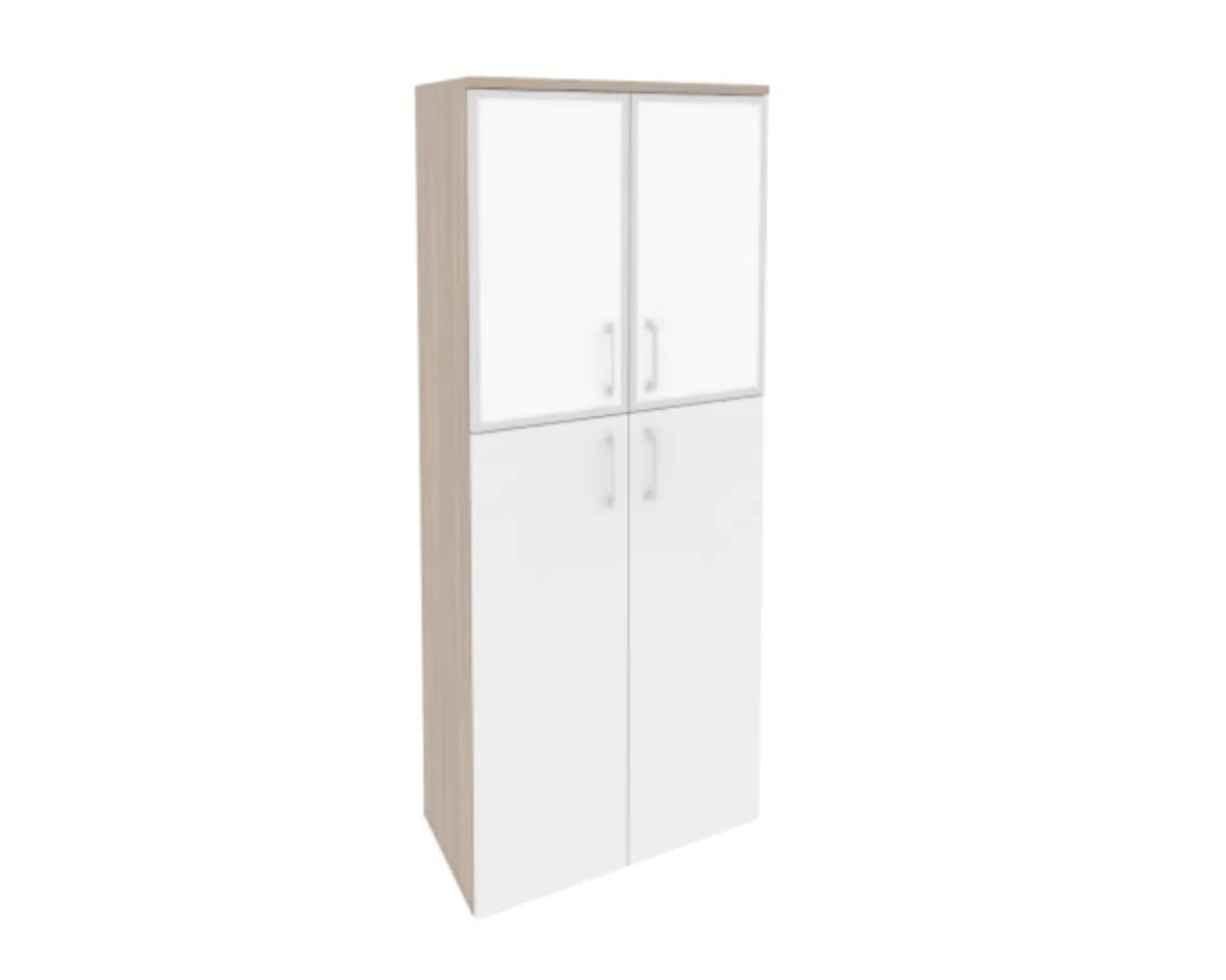 Шкаф высокий широкий (2 средних фасада ЛДСП + 2 низких фасада стекло лакобель в раме) фасад белый бриллиант дуб аттик