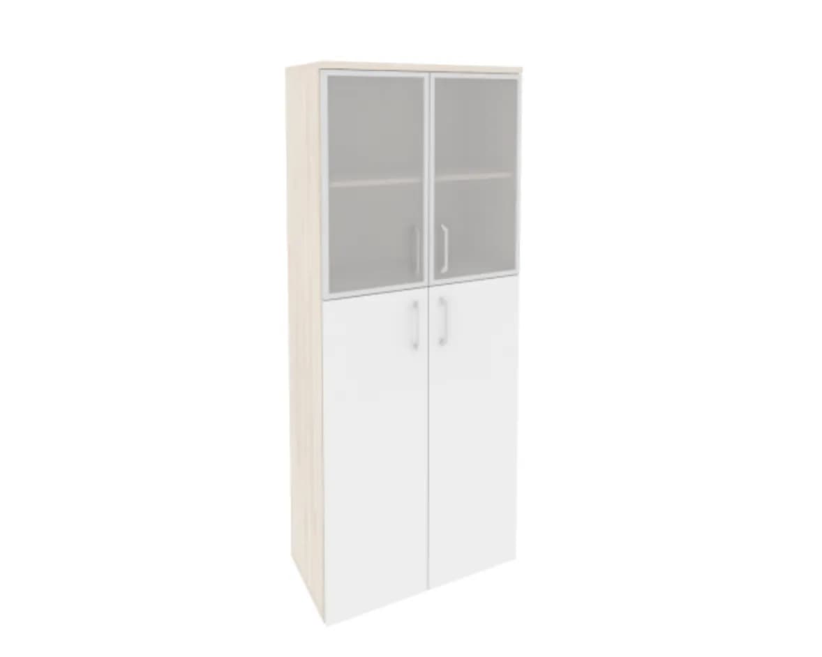 Шкаф высокий широкий (2 средних фасада ЛДСП + 2 низких фасада стекло в раме) фасад белый бриллиант денвер светлый