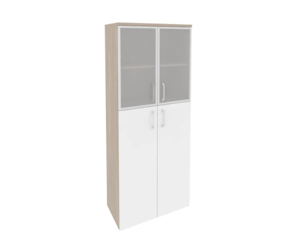 Шкаф высокий широкий (2 средних фасада ЛДСП + 2 низких фасада стекло в раме) фасад белый бриллиант дуб аттик