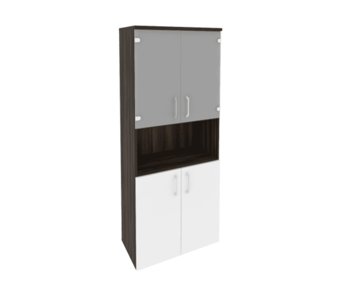 Шкаф высокий широкий (2 низких фасада ЛДСП + 2 низких фасада стекло) фасад белый бриллиант, дуб мали