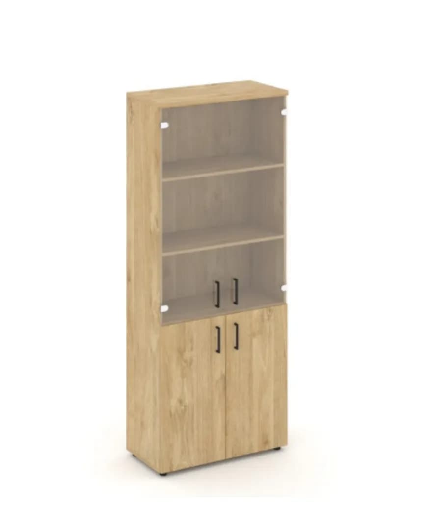 Шкаф высокий широкий (2 низких фасада ЛДСП + 2 средних фасада стекло прозрачное) тиквуд светлый